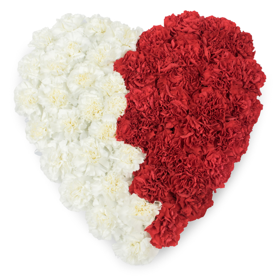Our heart-shaped bouquet features a stunning combination of white and red carnations, expertly arranged to symbolize love and sympathy. Each flower is hand-selected for premium quality and unwavering freshness.